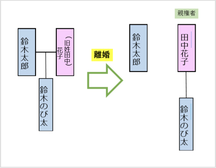 例えば、旧姓「田中花子」さんが「鈴木太郎」さんと結婚して鈴木姓となり、「鈴木のび太」くんという子どもを授かったケースを見てみましょう。5年後に夫婦が離婚し、花子さんは田中姓に戻り、のび太くんの親権者として一緒に暮らしています。